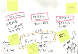 チーム「Family five」は、5名のメンバーがそれぞれワークを通じて「家族」に関するキーワードを挙げたことから名付けられました。組織内でも家族の